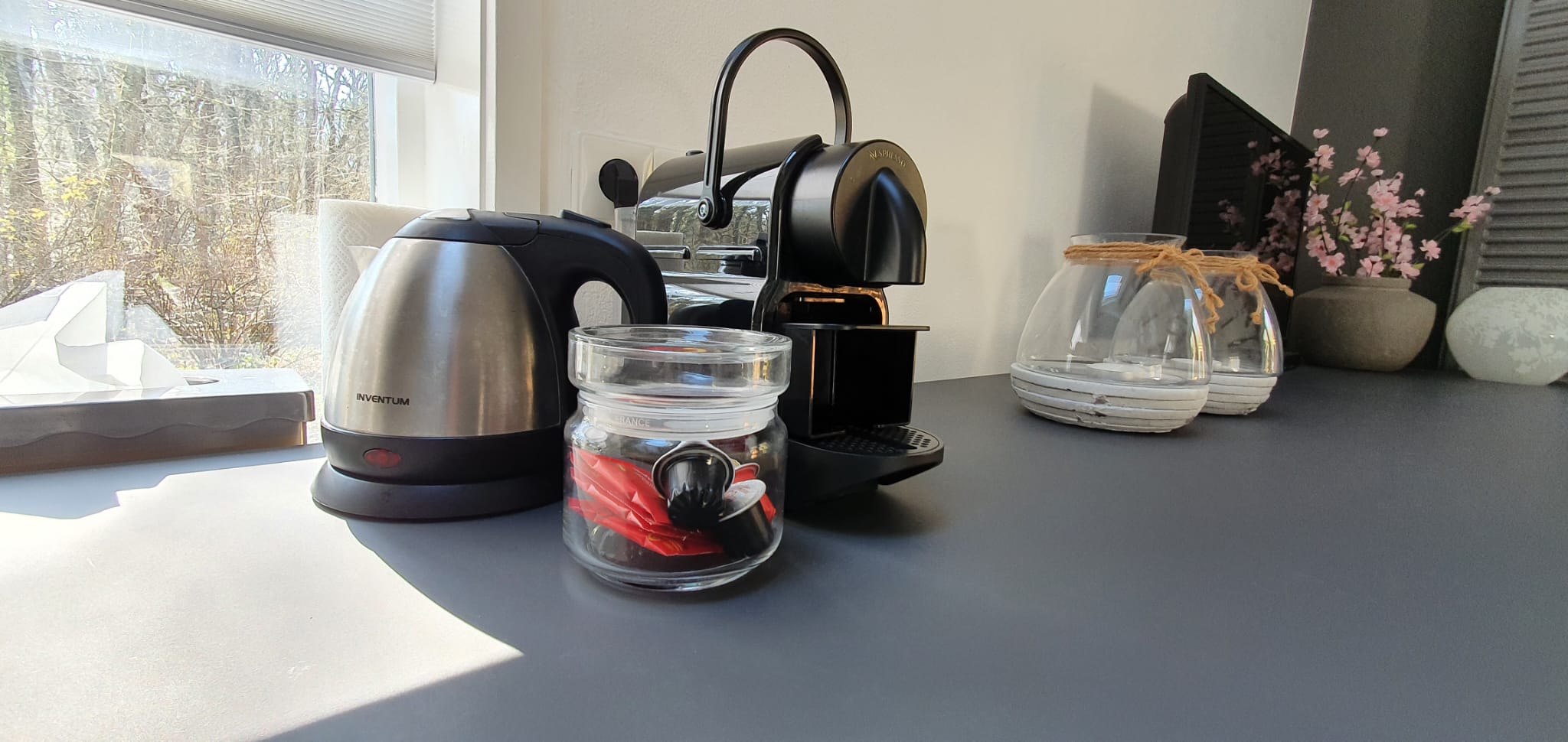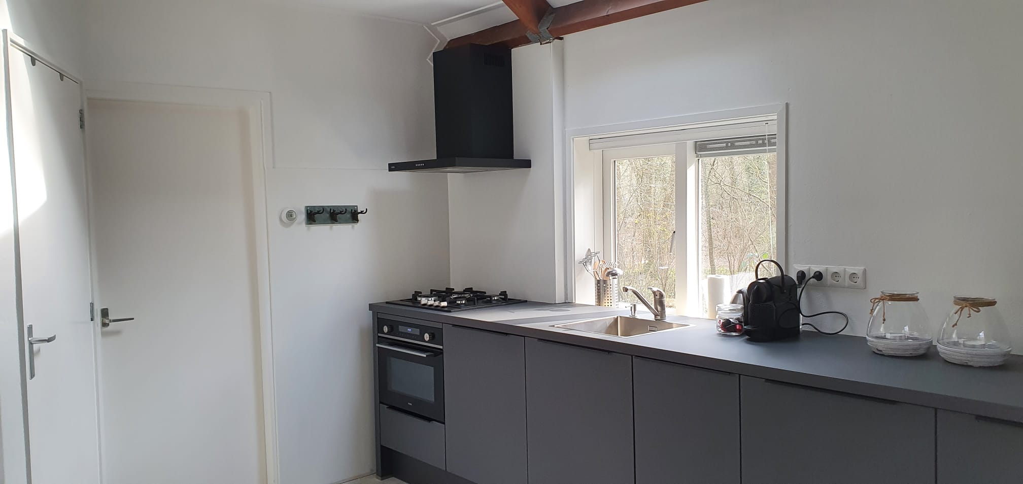 Verder tref je in de open keuken een 4-pits gaskookplaat, een combi oven/magnetron, koelkast met klein vriesgedeelte, vaatwasser, Nespresso koffiemachine, waterkoker en voldoende serviesgoed.