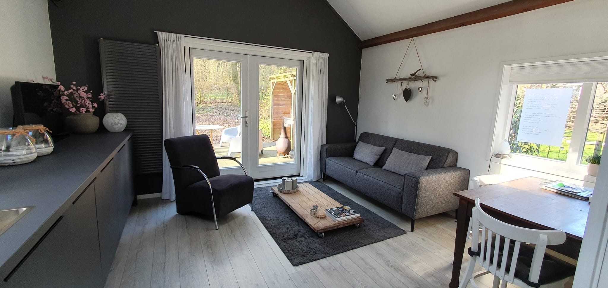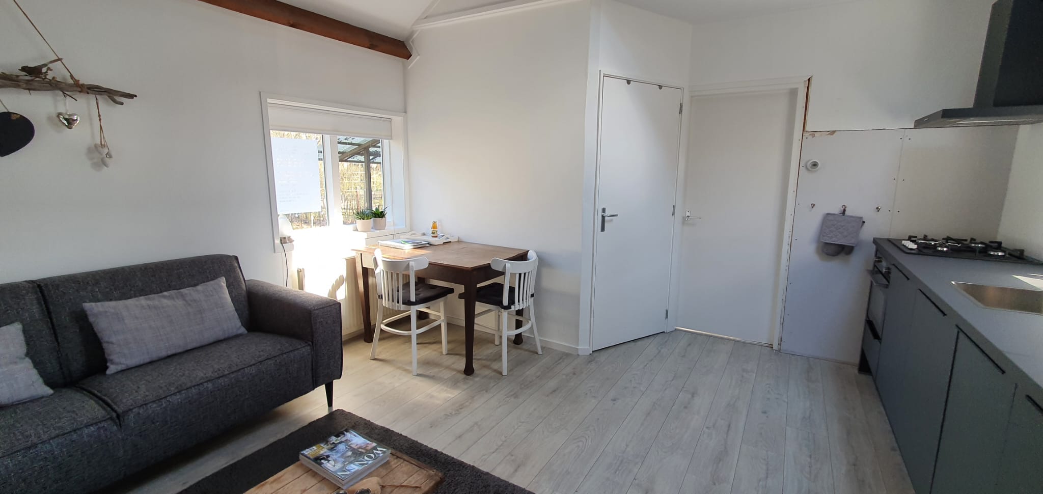 Het huisje heeft een gezellige en modern ingerichte woonkamer met eethoek en een prachtige nieuwe open keuken. Er is een tv (met ingebouwde dvd-speler), comfortabele bank én gratis super snelle wifi via glasvezel.